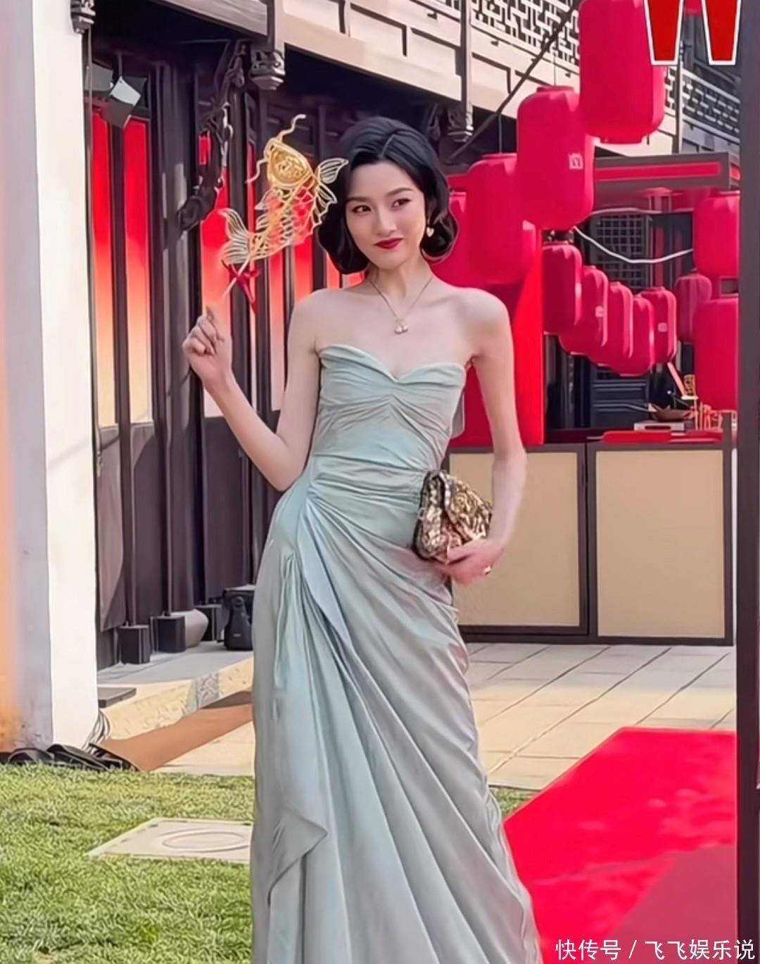 可是偏偏不知道为何,脖子那儿冒出了一朵颜色老气横秋的花。加上这朵花以后,孙俪就更显老了,有点像婚礼主持人戴个花进场似的。要是没戴这朵花,整体穿搭看起来还是挺OK的,不过说不定设计师觉得只靠那身衣服走红毯太单调,所以加了这点儿配饰。